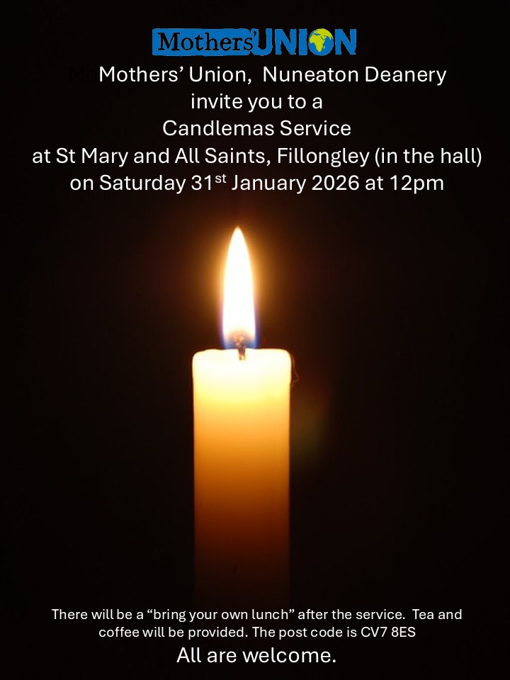 As you know, we will be hosting the Nuneaton Deanery Candlemas Service at Fillongley on Saturday 31st January at 12pm in the hall. I am very happy that Revd. Steve Medley has kindly agreed to lead the service again.
