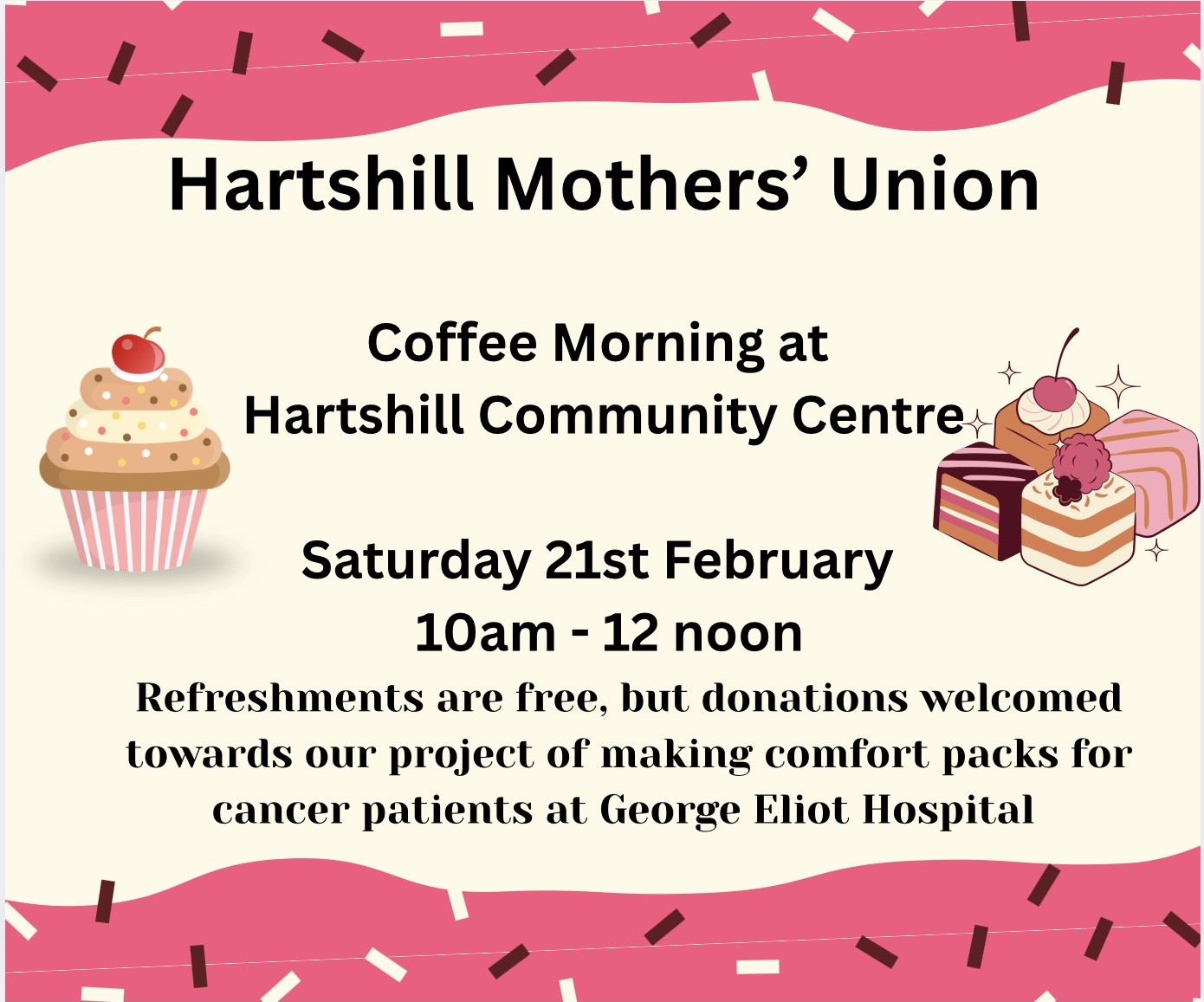 “Hello Aphra, Just to let you know that Hartshill Mothers Union members are going to compile some packs in the new year. We are holding a coffee morning at the Hartshill Community Centre on Saturday 10th January between 10.30 and 12.30 to raise some money to fund the packs. As suggested we will put soft toothbrushes, puzzle books pencils/pen, sensitive hand cream and soft top socks in each pack with a message from MU. We will have one on show at the coffee morning with the list of suggested items needed. Obviously if you have any publicity material we can display it on the day. We could supply some books too with the packs together with hats, scarves and blankets at a future date depending on funds. The coffee morning is held with the support of Holy Trinity Church, Hartshill and are held about every six weeks for the benefit of Church funds and MU charity work. Is it acceptable to keep the books separate so that the person can choose their book? It would also mean we could use the bags we currently have in stock which we use for the Emergency packs for A and E.. It may be possible that you could come to a future MU meeting(held 3rd Wednesday of each month between 2.00-4.00) to receive the packs otherwise our Branch Leader and myself could bring them to the Hospital. I’ll update you as and when the packs are ready which I hope will be late January/ early February at the latest. Regards, Sheila On behalf of Hartshill MU.
